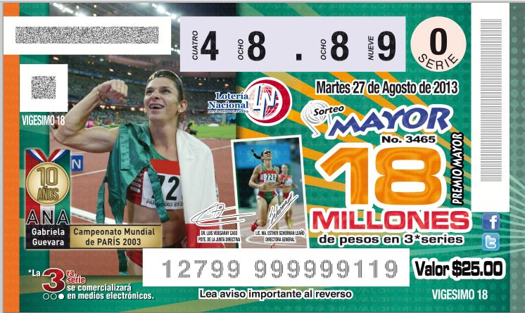 México, D.F.- A diez años de que Ana Gabriela Guevara consiguiera paralizar al país por 48.89 segundos al obtener el título mundial de los 400 metros planos, la Lotería Nacional ha decidido rendirle un homenaje a la hoy Senadora, por ello a partir de mañana 6 de agosto pondrá en circulación un billete con su imagen.